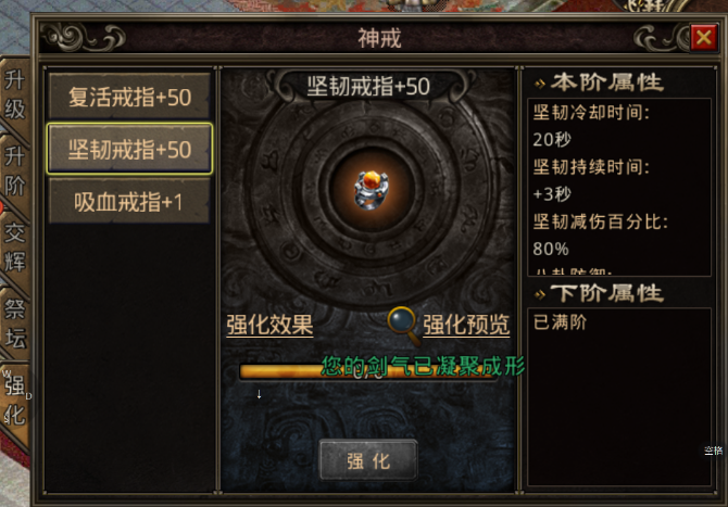 坚韧戒指强化满级能够获得:275点八卦防御、15%/10%(战士/法道)暴击伤害减免;