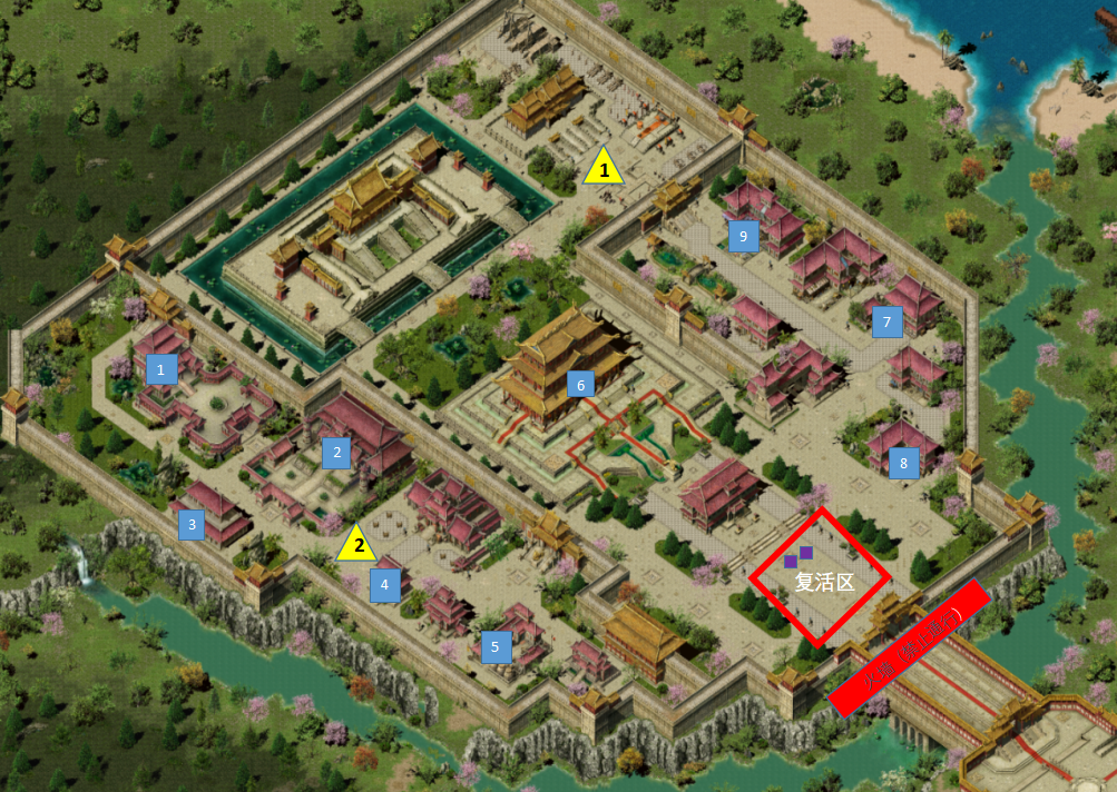进入活动地图后,勇士血量和蓝量全部提升至五倍。天有灾星,神光现世。此时可前往龙飞城坐标(192:147)和龙飞城(120:307)两处寻找世界首领。图中三角黄色1、2号点。为了守护龙飞城的安宁,请各位勇士前往击退他们吧!